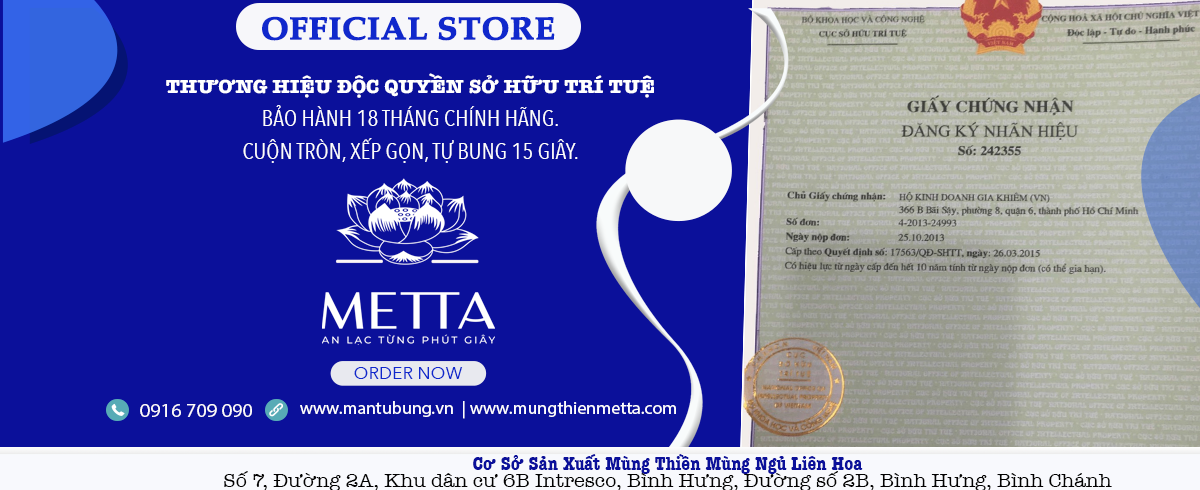 Sản phẩm đăng ký độc quyền. Khuyến cáo khách hàng chú ý hiện nay nhiều cơ sở mùng tự bung thiếu trung thực đã lấy cắp một số hình ảnh mùng Metta đưa lên website của mình chào hàng. Quý khách hãy xem hàng đúng miêu tả.